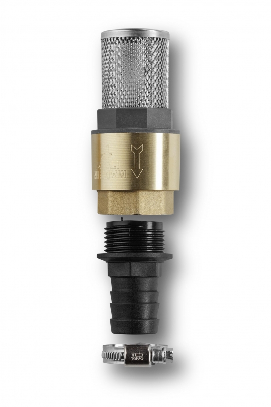 В прочном металлополимерном исполнении. Для присоединения к всасывающим шлангам, поставляемым метражом. С хомутом. Обратный клапан ускоряет повторный пуск насоса.
