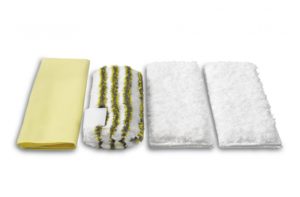 Набор микроволоконных салфеток Karcher для оптимальной уборки в ванной: 2 специальные салфеток для пола из мягкого плюша, 1 абразивная салфетка для удаления стойкого известково-мыльного налета и 1 полировальная салфетка для зеркал и других поверхностей.